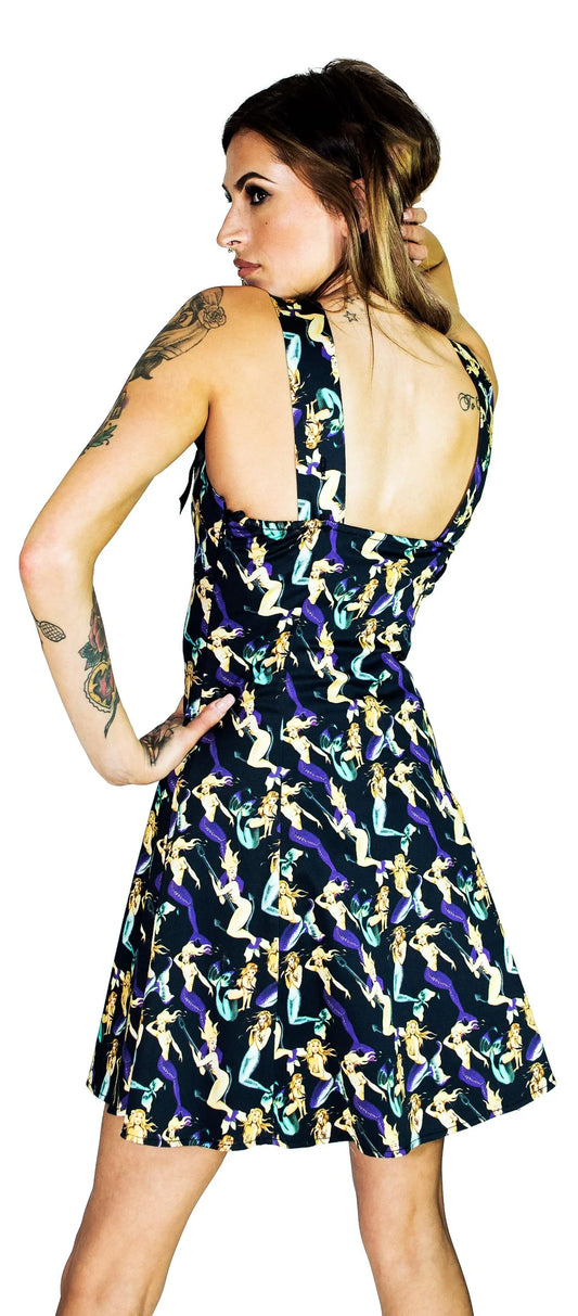 Mermaids Print Black Halterneck Mini Dress - Riley