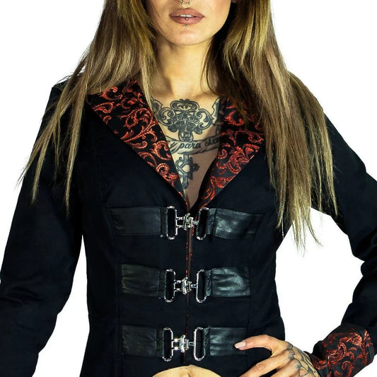 Red Brocade Details Short Black Cotton Jacket - Acantha