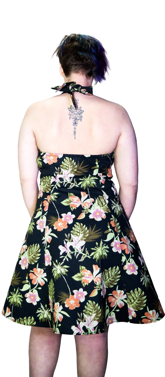 Palm Trees And Exotic Flowers Black Plus Size Retro Midi Dress - Marrama